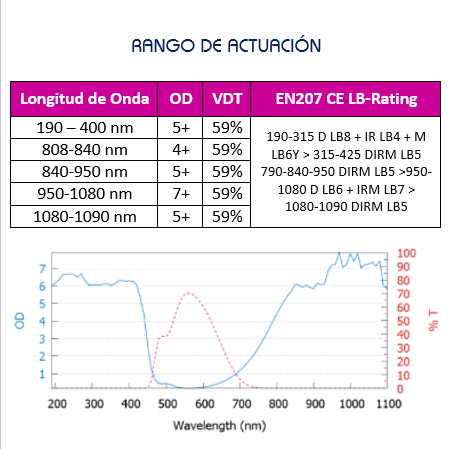 Montura que neutraliza el laser Neodimio Yag, protegiendo dentro de un intervalo 720-1090nm. Proteger los ojos para evitar enfermedades oculares es de vital importancia, y al estar en contacto con este tipo de rayos laser, mas todavía. Deben estar homologadas para una buena protección y garantía de seguridad.