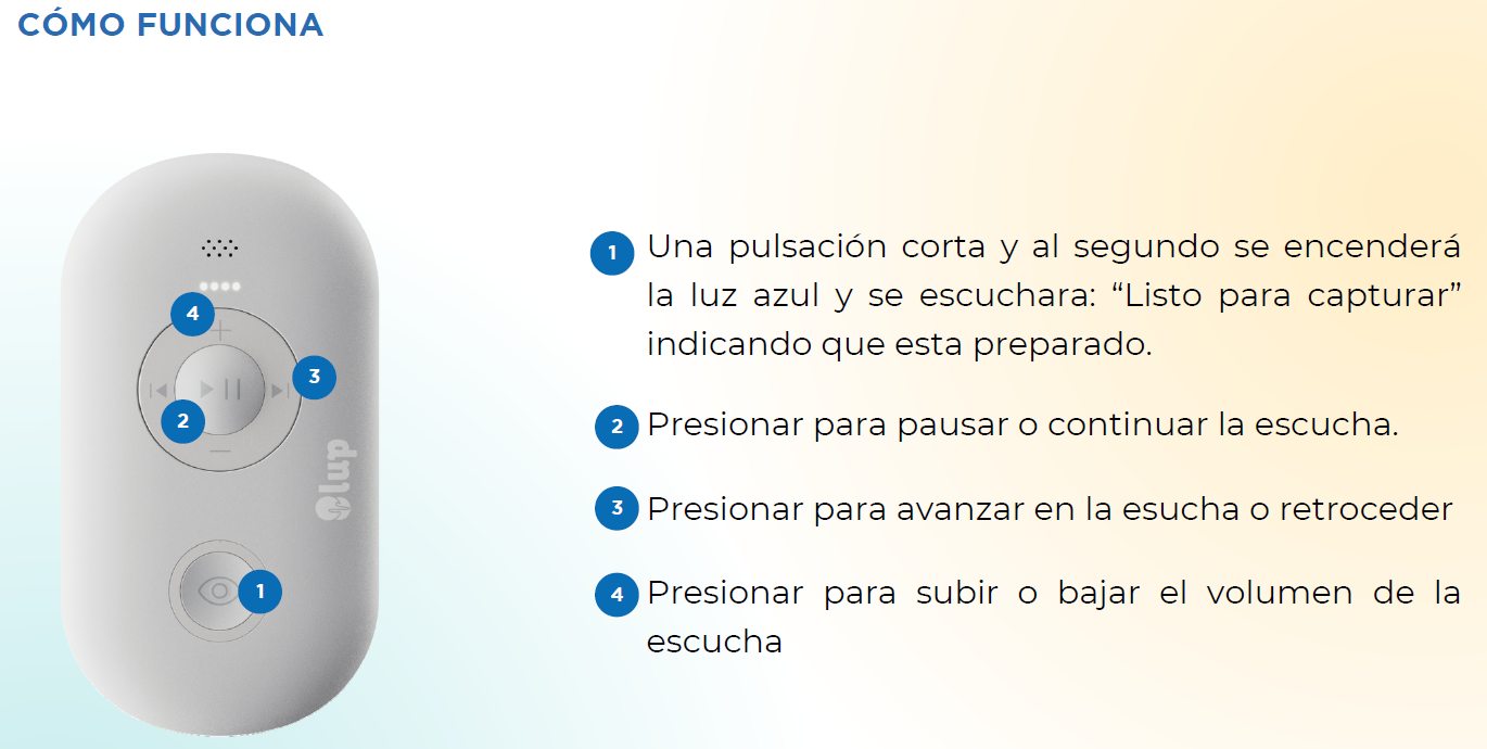 La Lupa de Bolsillo Inteligente es la primera en el mundo en incorporar un asistente de lectura que convierte cualquier tipo de texto a voz encuestión de segundos. No requiere conexión a Internet, es capaz de leer y traducir más de 30 idiomas y su uso es extremadamente sencillo.