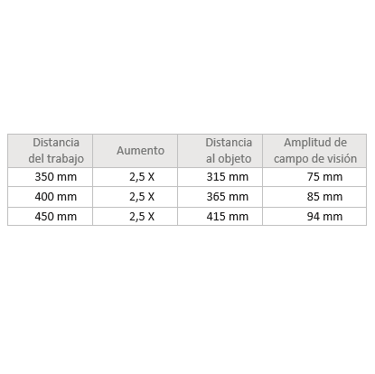 - Distancia de trabajo del sistema óptico.