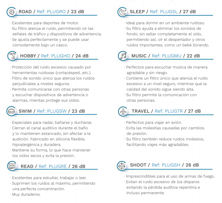 Protectores auditivos universales y reutilizables de alta calidad para todo tipo de condiciones. Dependiendo de su utilización y atenuación demandada por el paciente, puede elegirse el filtro adecuado para el ruido que va a soportar. El precio es por 2 pares de tapones.